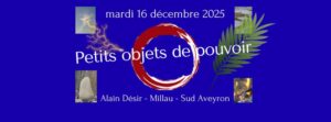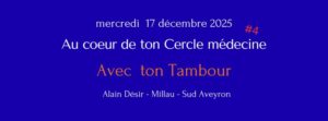 Bonjour, je propose ces journées indépendantes mardi 14 et mercredi 15 octobre, mercredi 19 novembre, mercredi 17 décembre ayant comme thème conducteur « Au coeur de ton cercle médecine », des propositions prenant en référence, classiquement, les 5 éléments. Au menu : Cercles de tambours et soins, cercle médecine, méditation et repas partagé. Mardi 16 décembre, atelier « Petits objets de pouvoir »